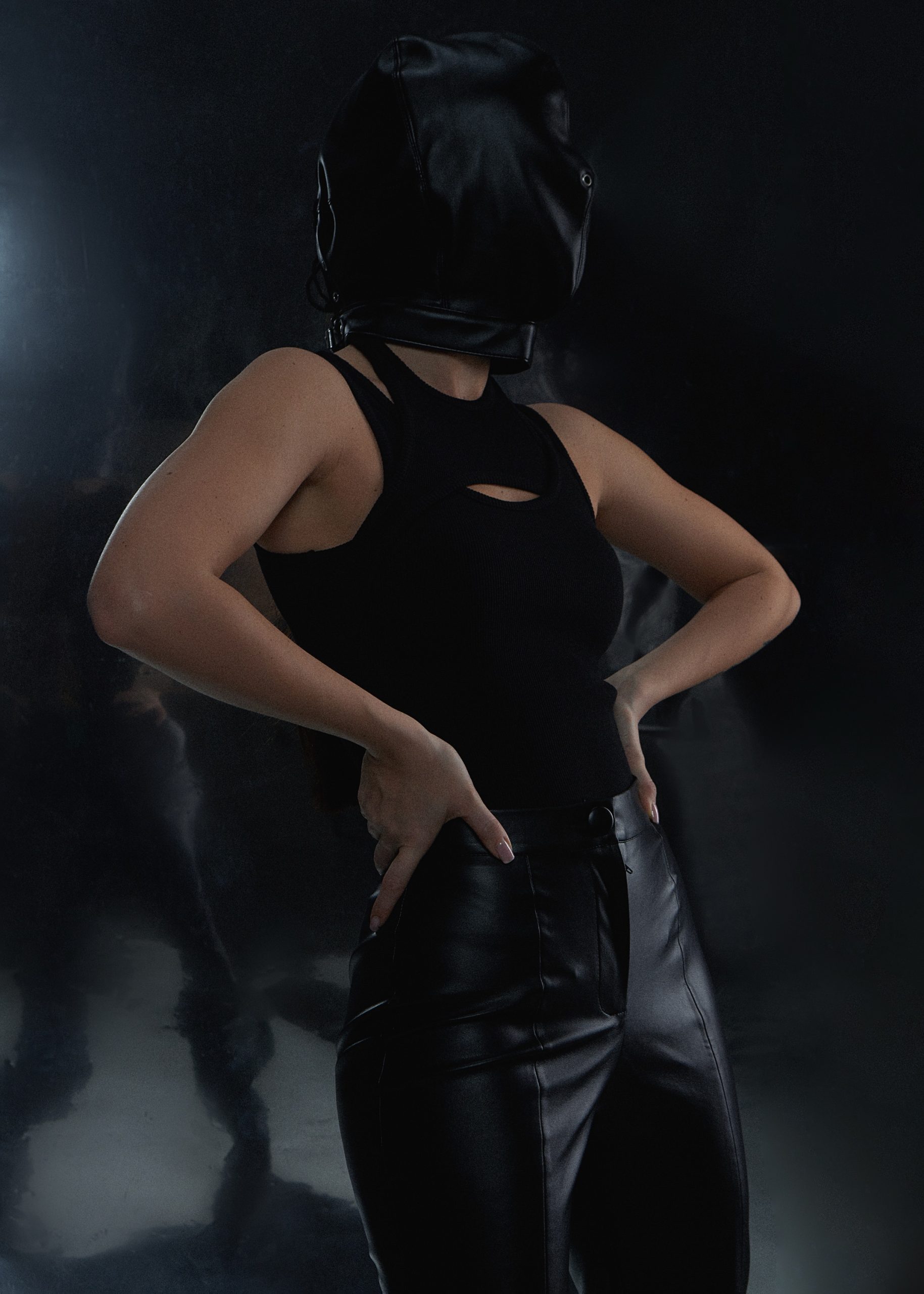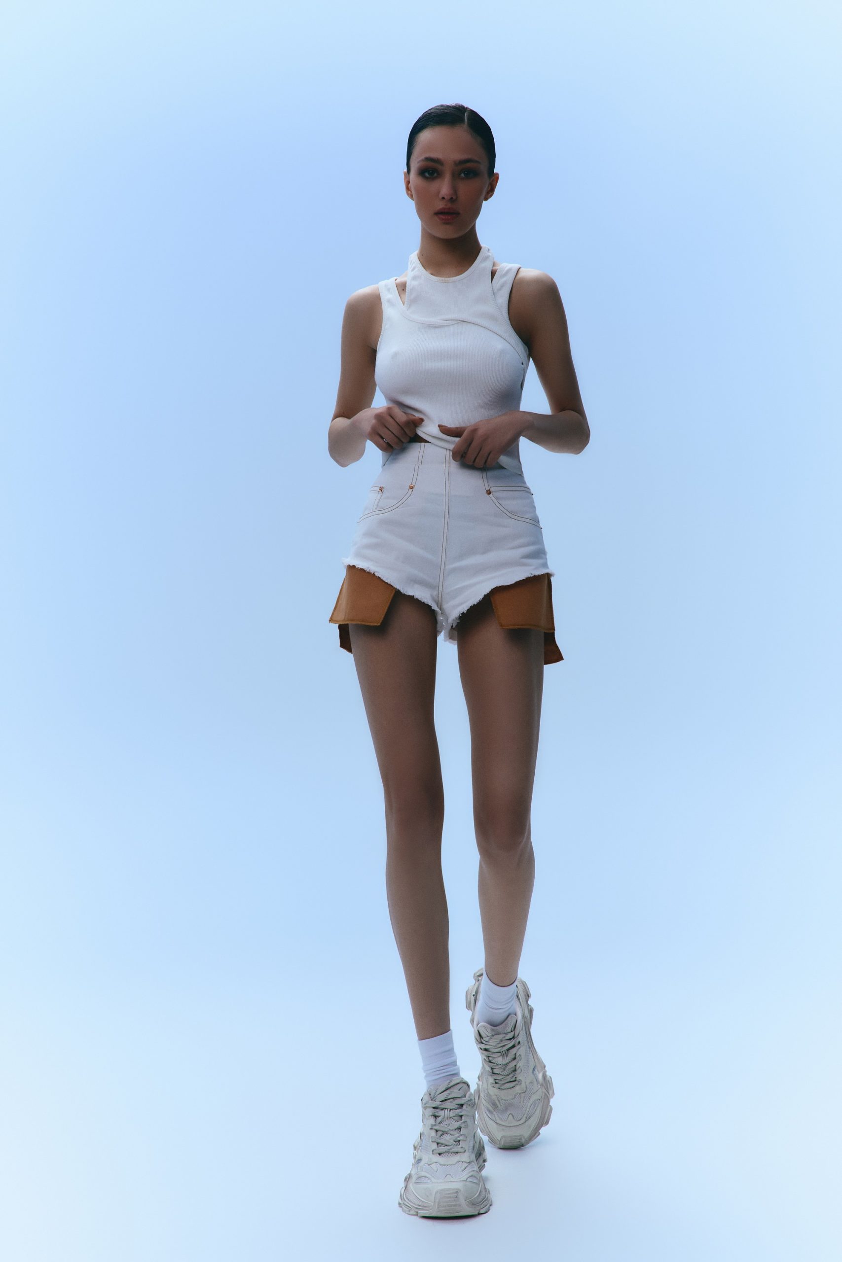 Укорочена модель з трикотажу у рубчик. Асиметричний перепліт, облягаючий крій, еластична тканина. Підходить для поєднання з речами із завищеною талією.