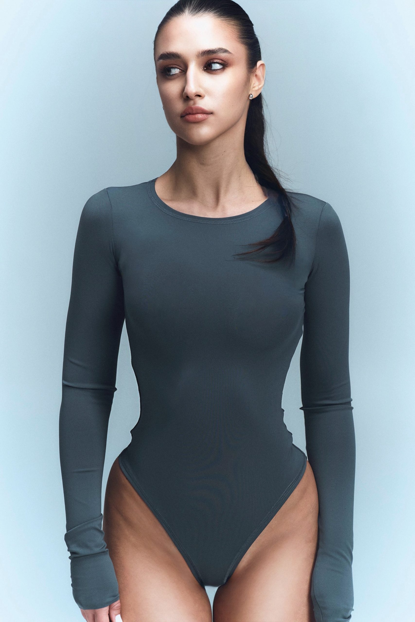 Базове боді з довгим рукавом у чорному кольорі щільно облягає фігуру, підкреслюючи силует. Еластична тканина забезпечує комфорт у носінні та не просвічується.