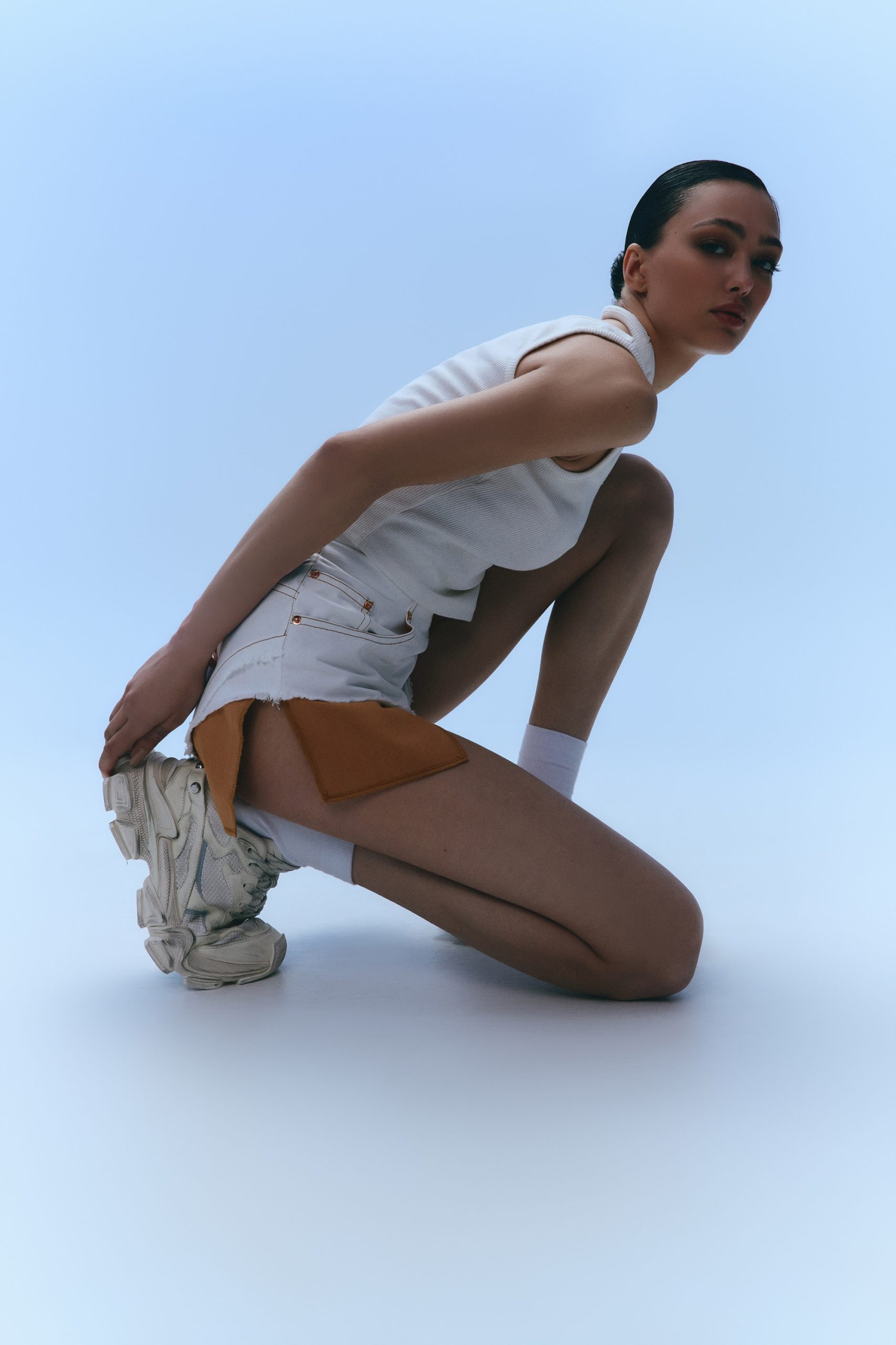 Шорти з високою посадкою та необробленим краєм. Застібаються на блискавку ззаду.
