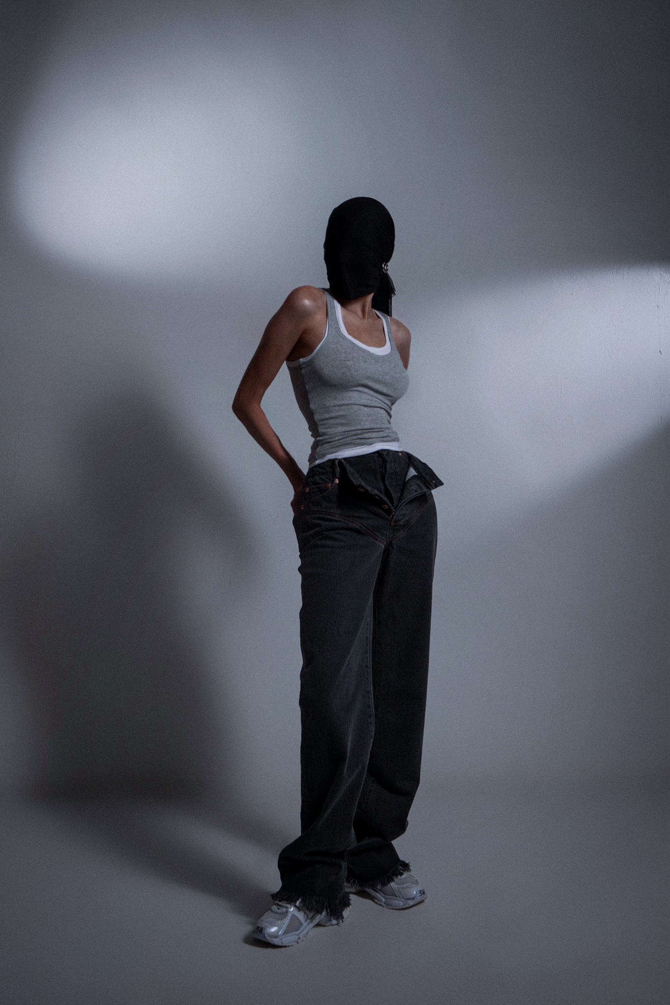 Джинси з високою посадкою, мають необроблений край та шлейки для ременя, що створює вінтажний ефект. Фурнітура має відтінок рожевого золота.