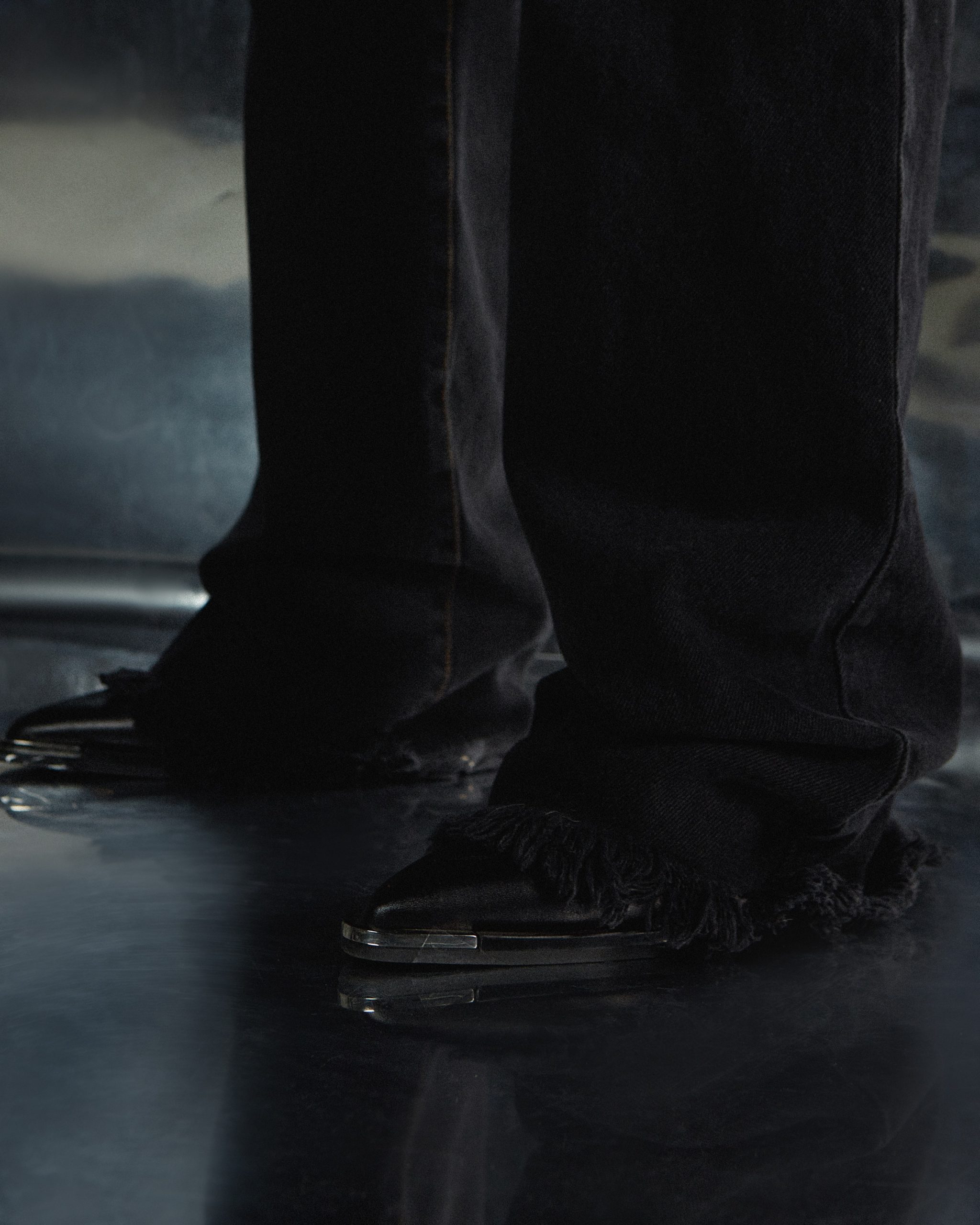 Джинси з високою посадкою, мають необроблений край та шлейки для ременя, що створює вінтажний ефект. Фурнітура має відтінок рожевого золота.
