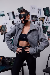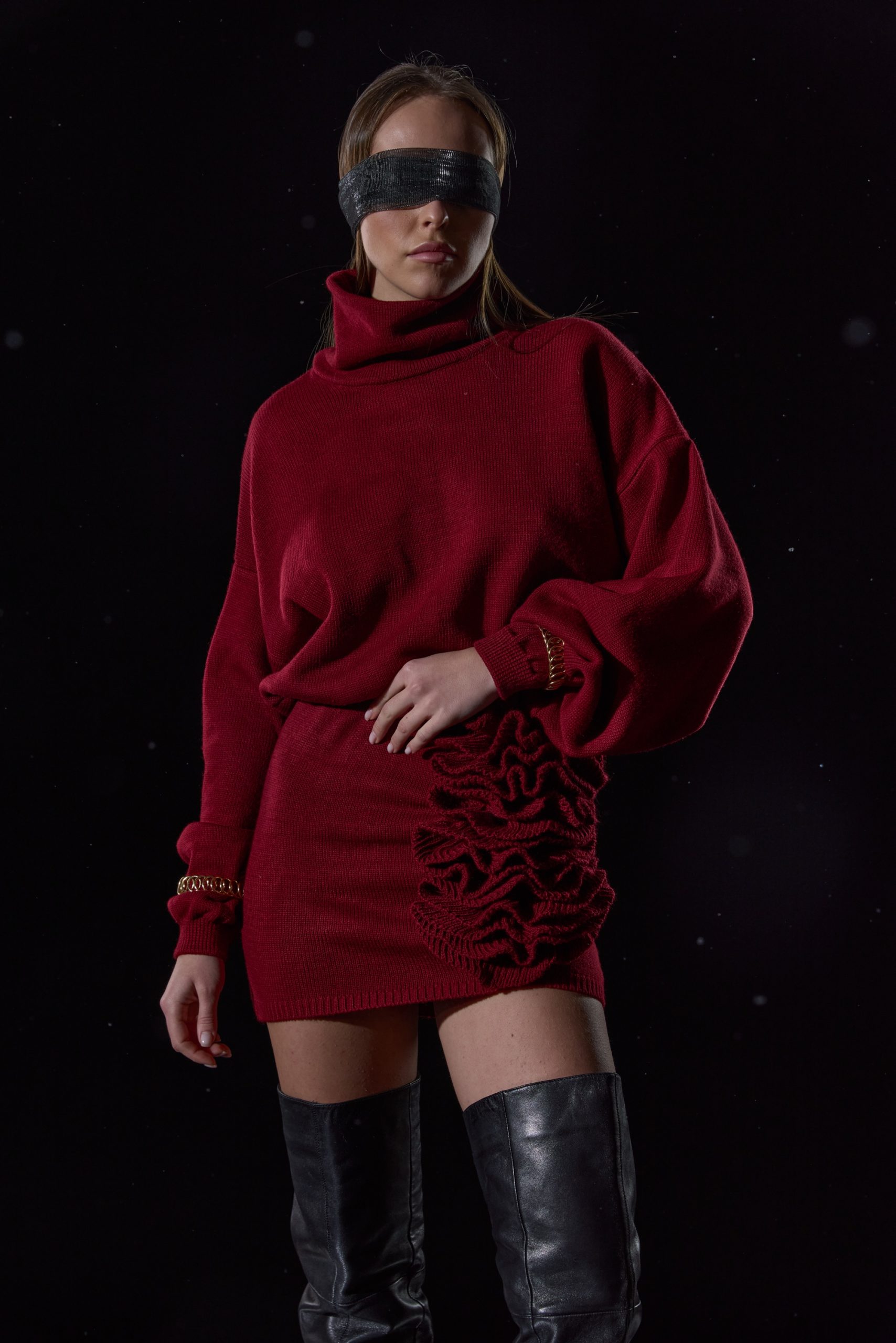 В’язаний костюм з укороченим светром-гольфом та мініспідницею з об’ємною рюшею. Стильний і комфортний варіант для створення жіночного образу