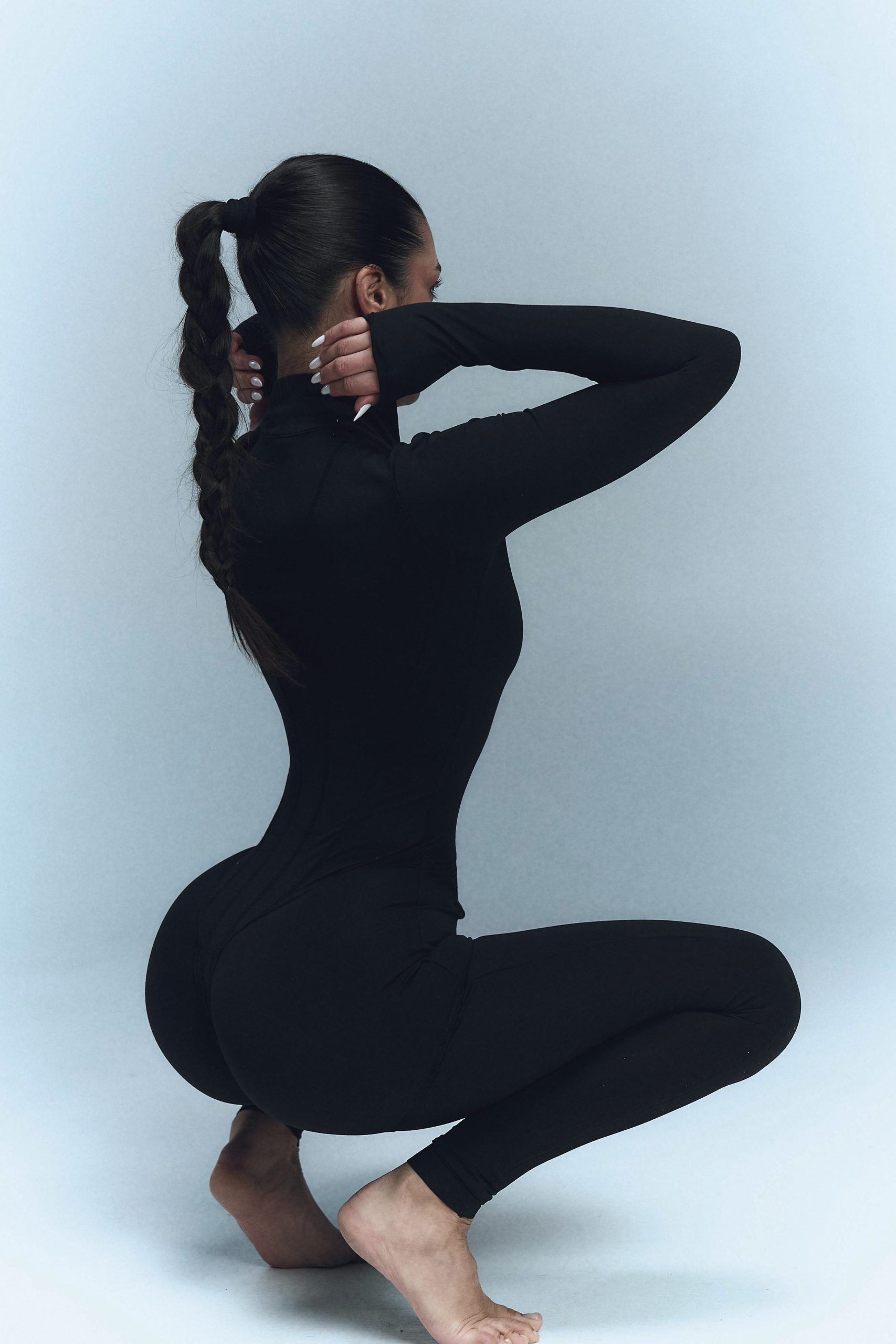 Комбінезон з довгим рукавом і блискавкою спереду. Акцентні лінії крою підкреслюють фігуру та створюють витончений силует. Високий комір, еластичний матеріал. Підходить для спорту, танців і активного відпочинку.