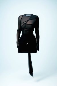 Червона мереживна мінісукня з акцентним вирізом у зоні декольте та подовленою декоративною стрічкою. Щільне еластичне мереживо підкреслює силует, а розкльошені рукави додають образу виразності. Ідеальний варіант для вечірніх виходів та особливих подій.