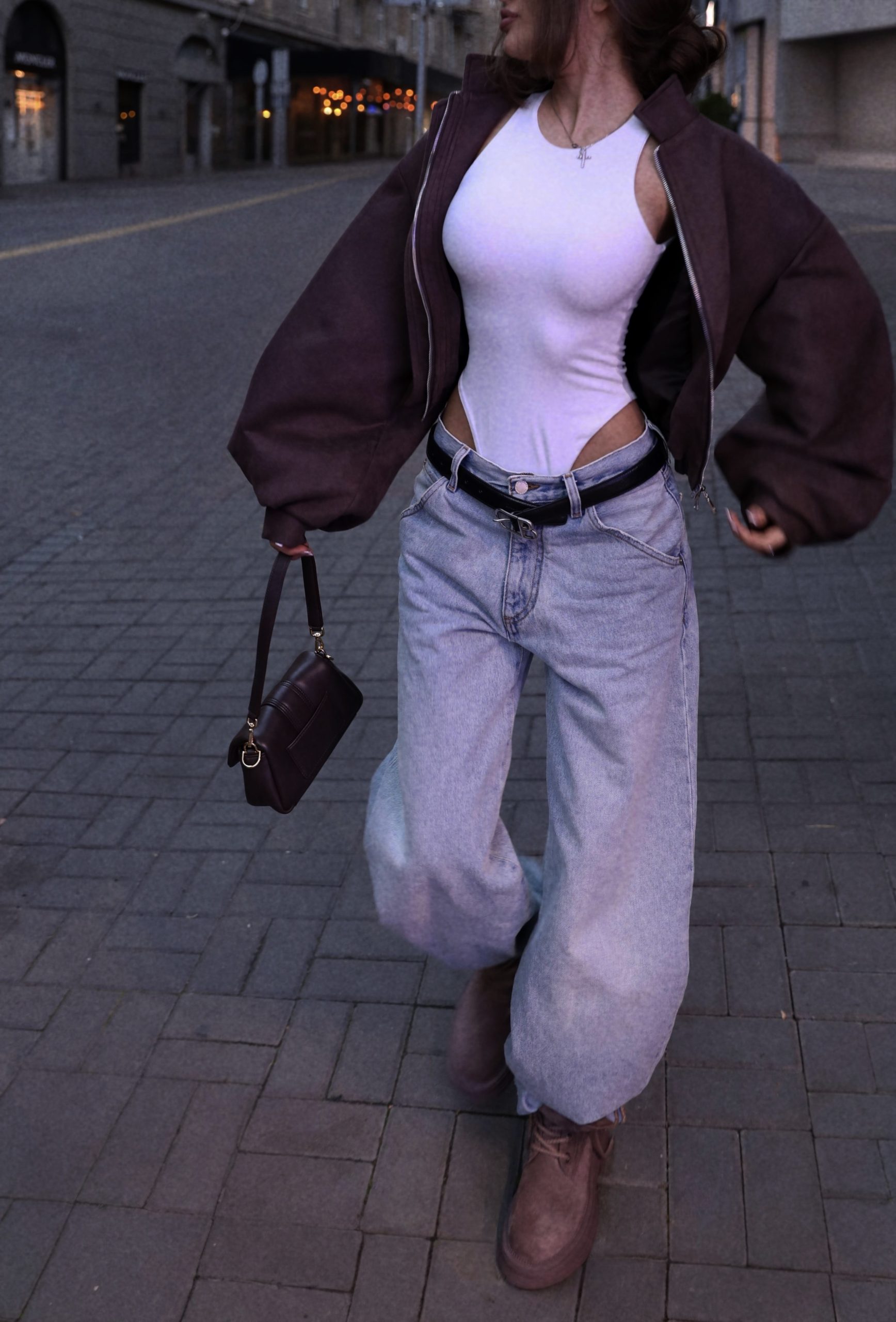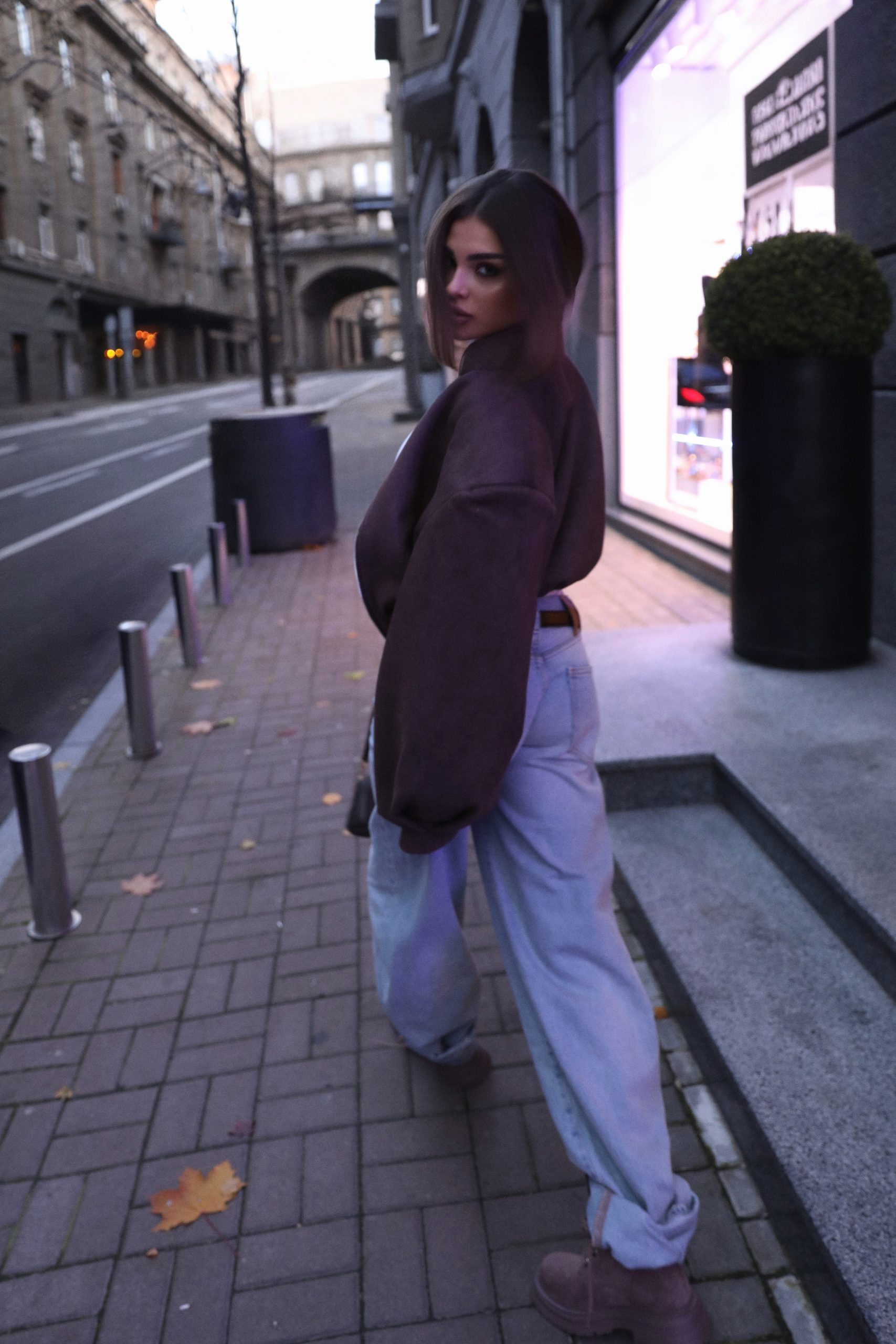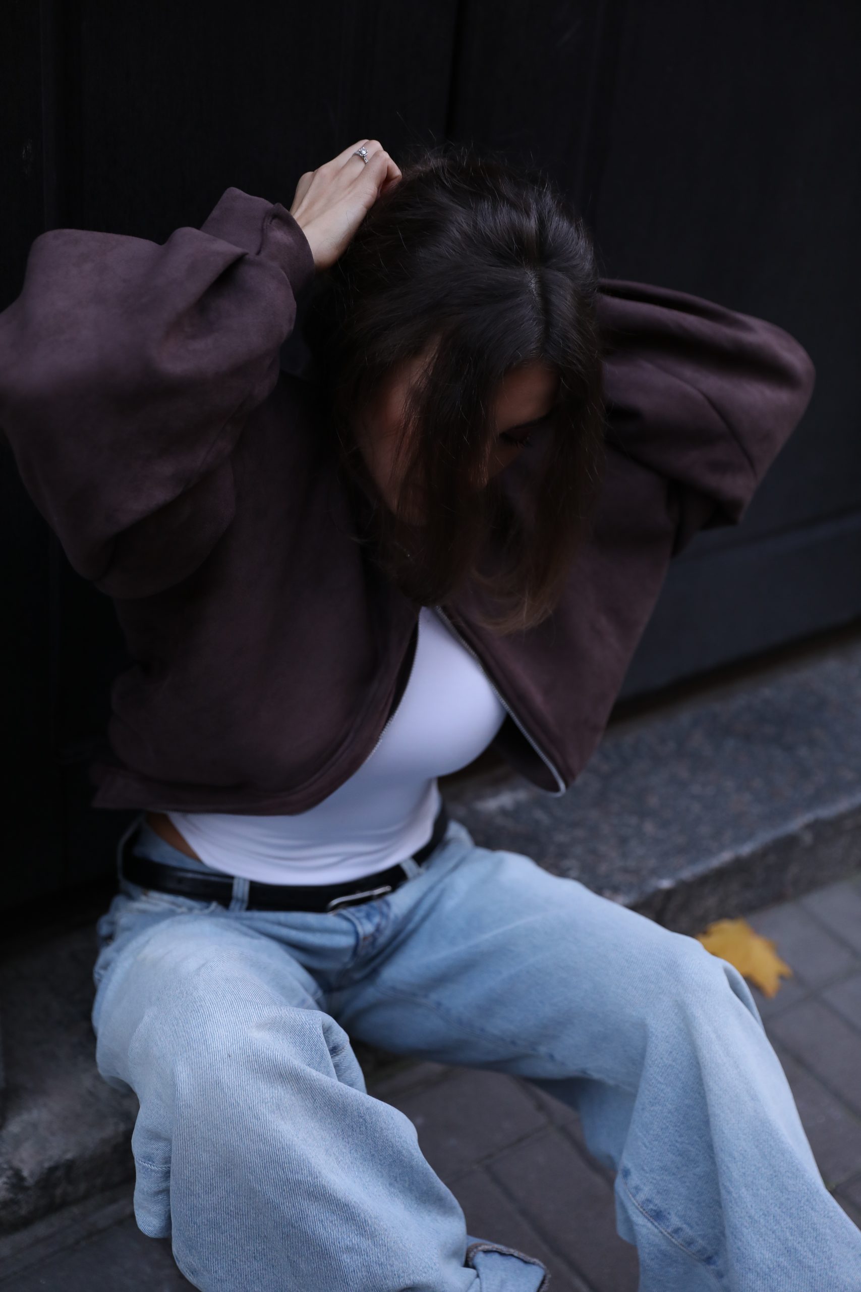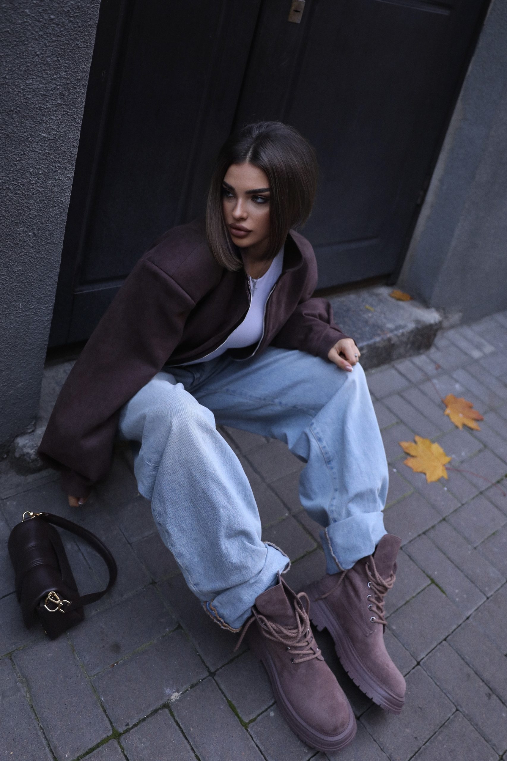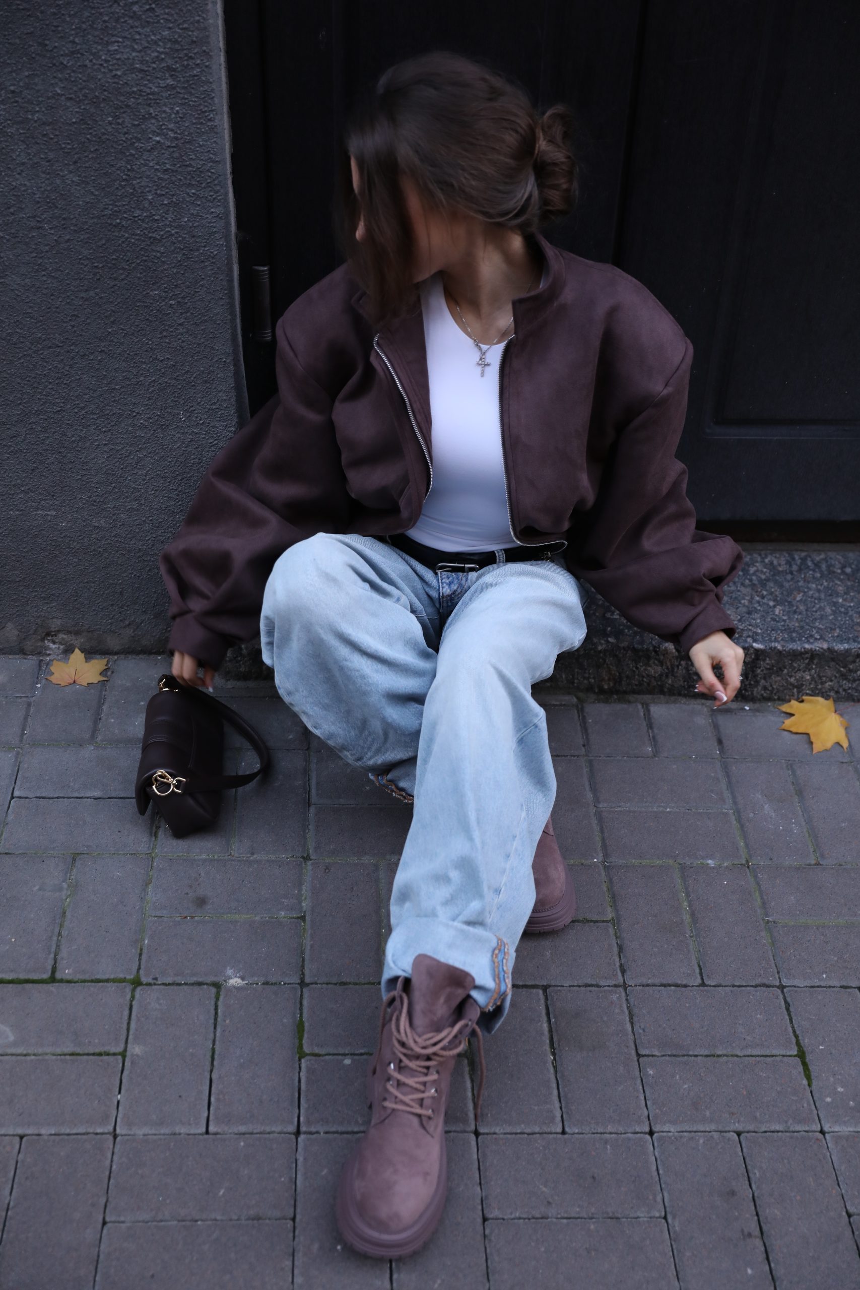 Утеплений бомбер із м’якої замші. Має обʼємний крій і вільні рукави.