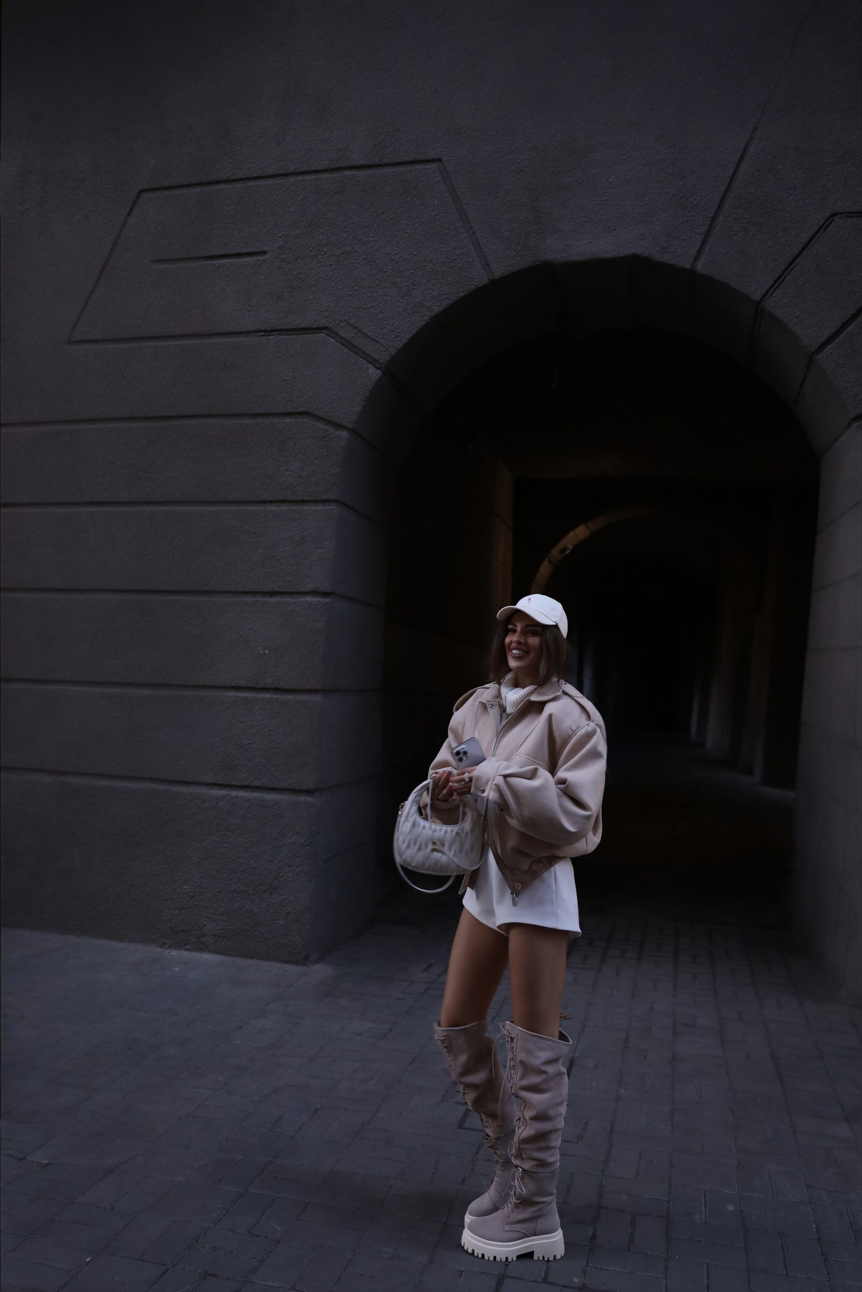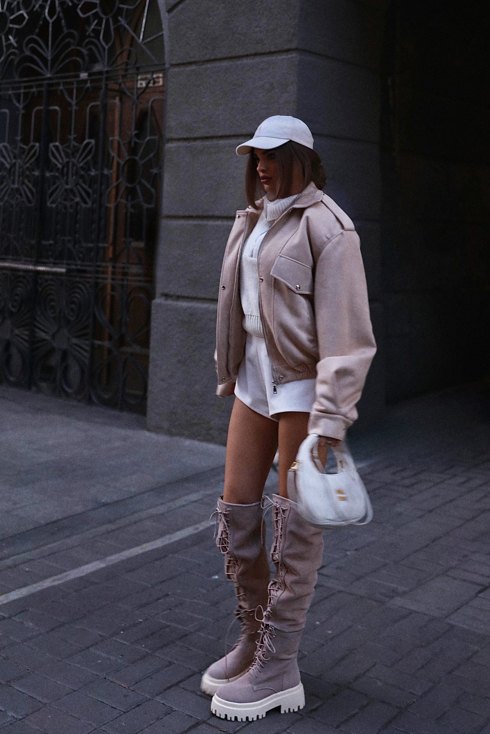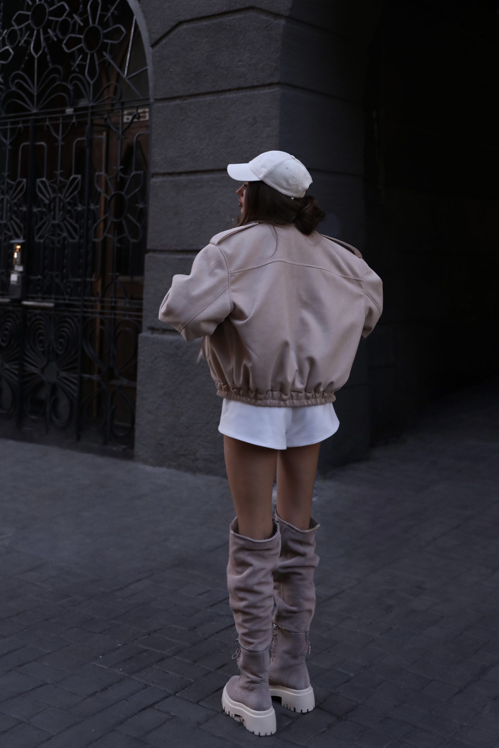 Подовжений утеплений бомбер із м’якої замші преміум-якости. Вільний оверсайз крій, подовжений силует, акцентна резинка знизу. Застібається на блискавку.