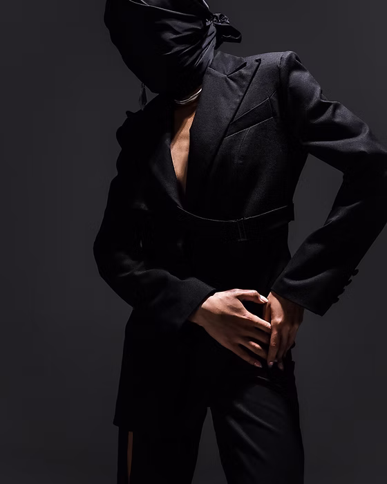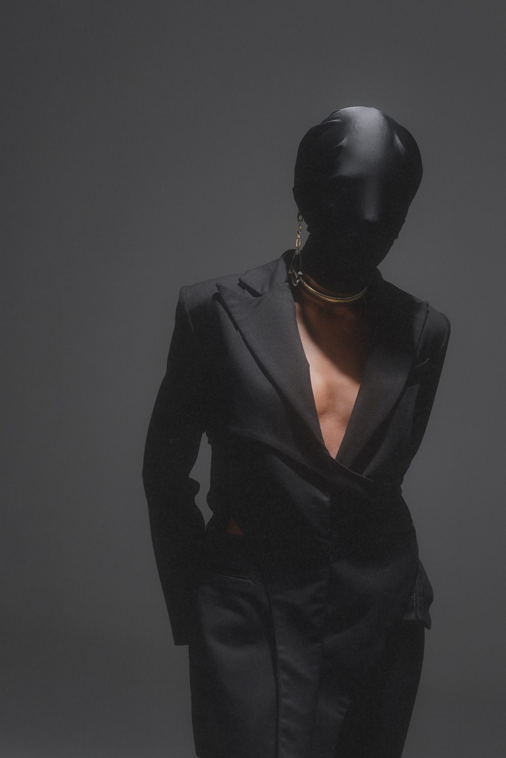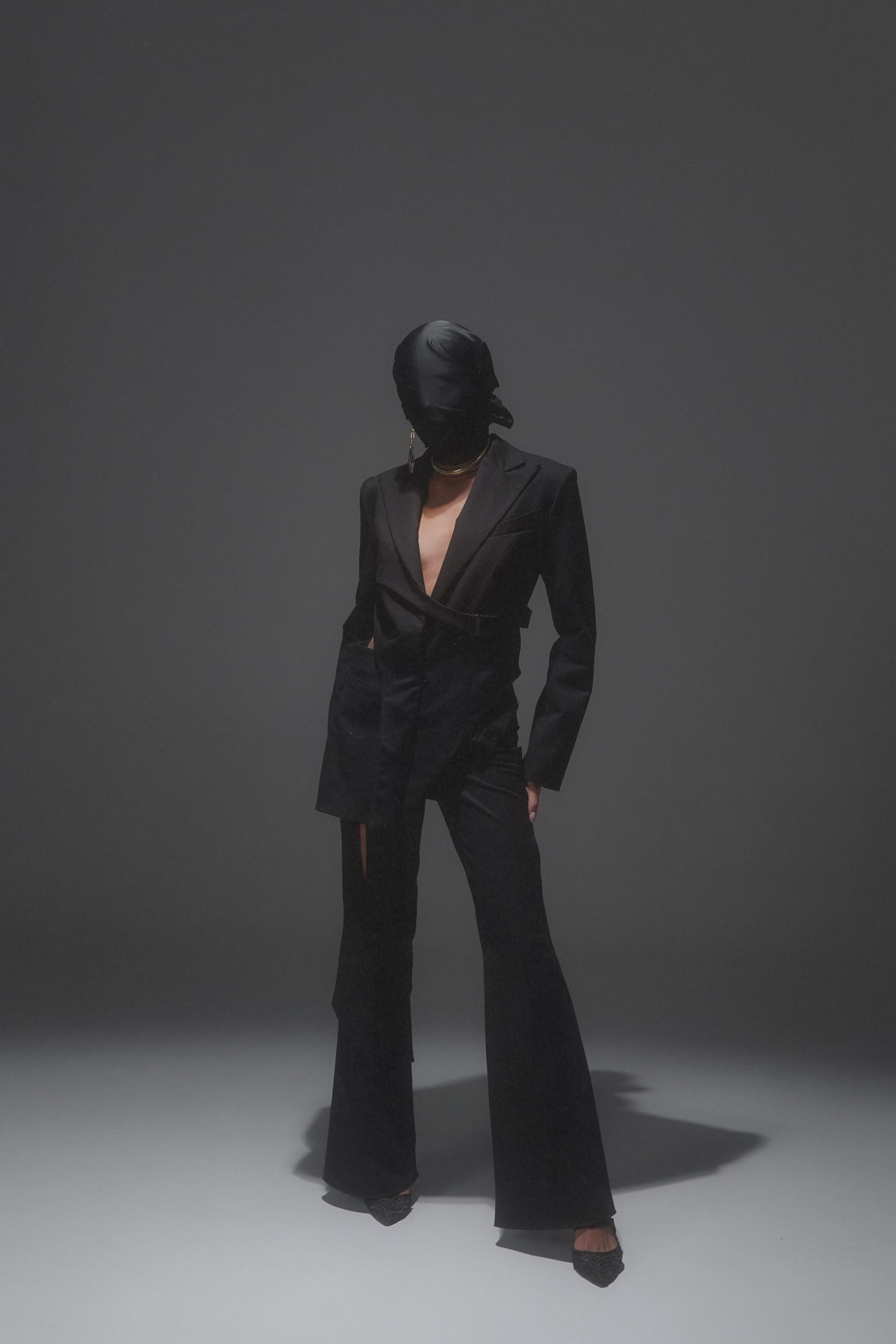 Костюм асиметричного крою, з акцентним вирізом на нозі, ідеально сідає по фігурі