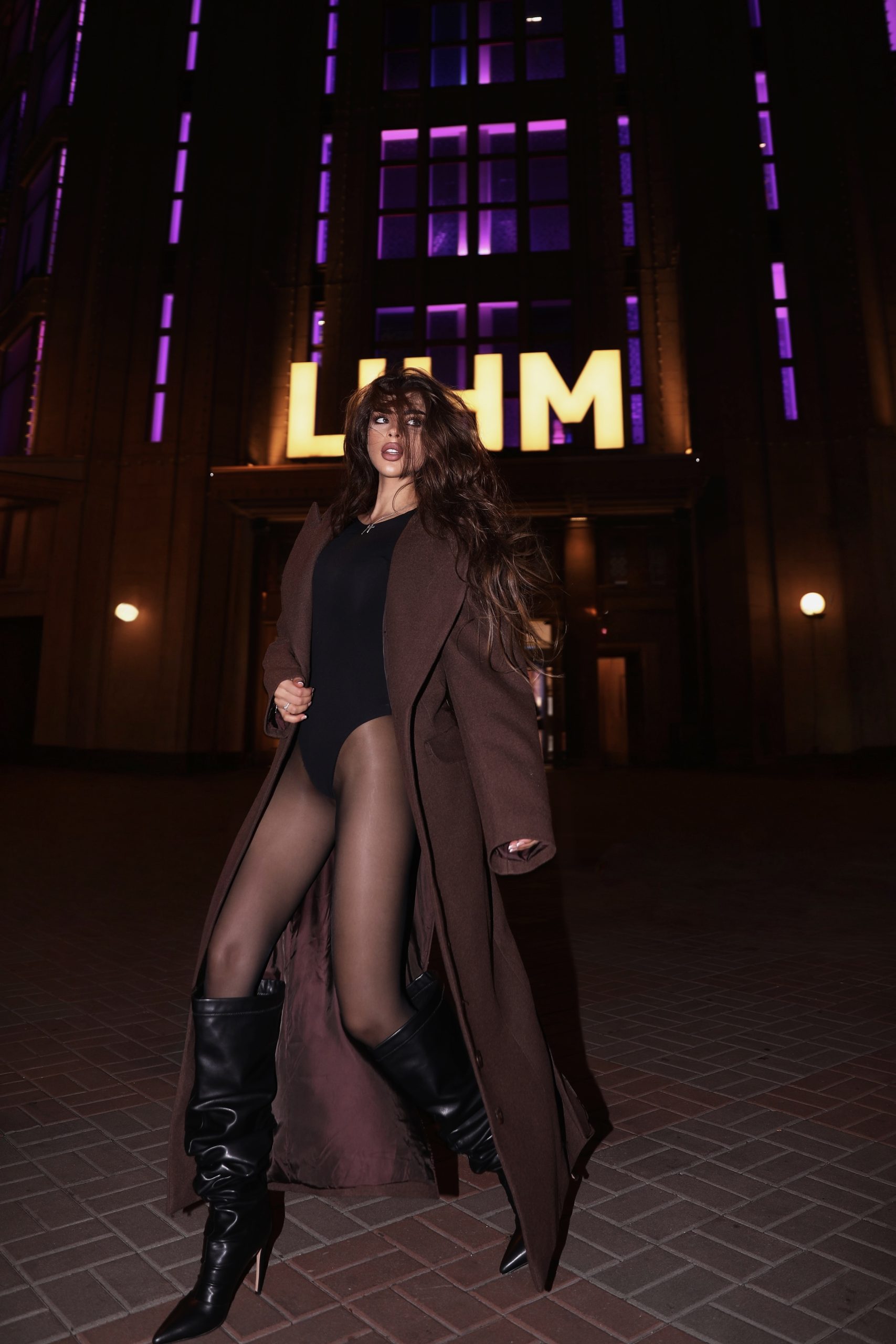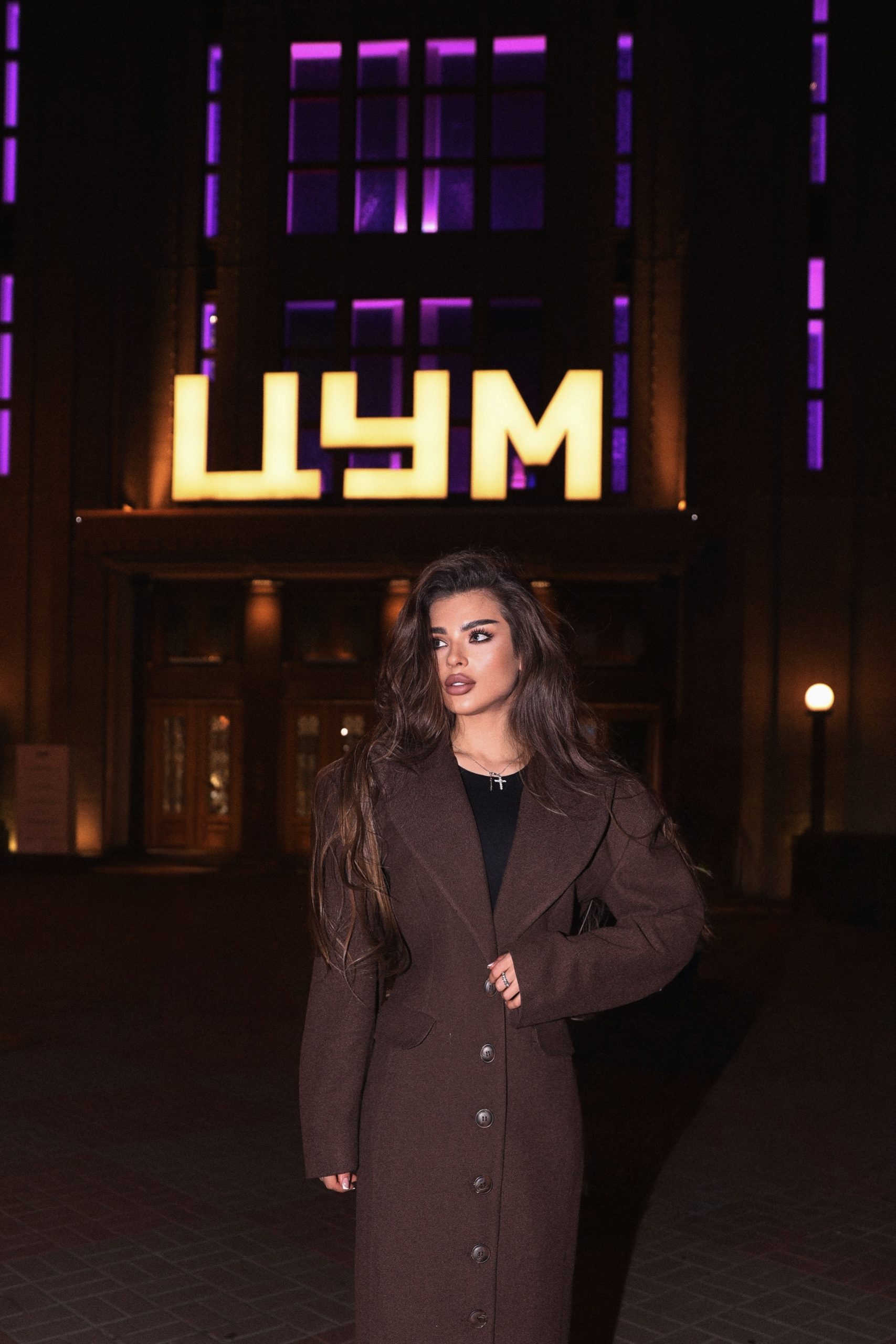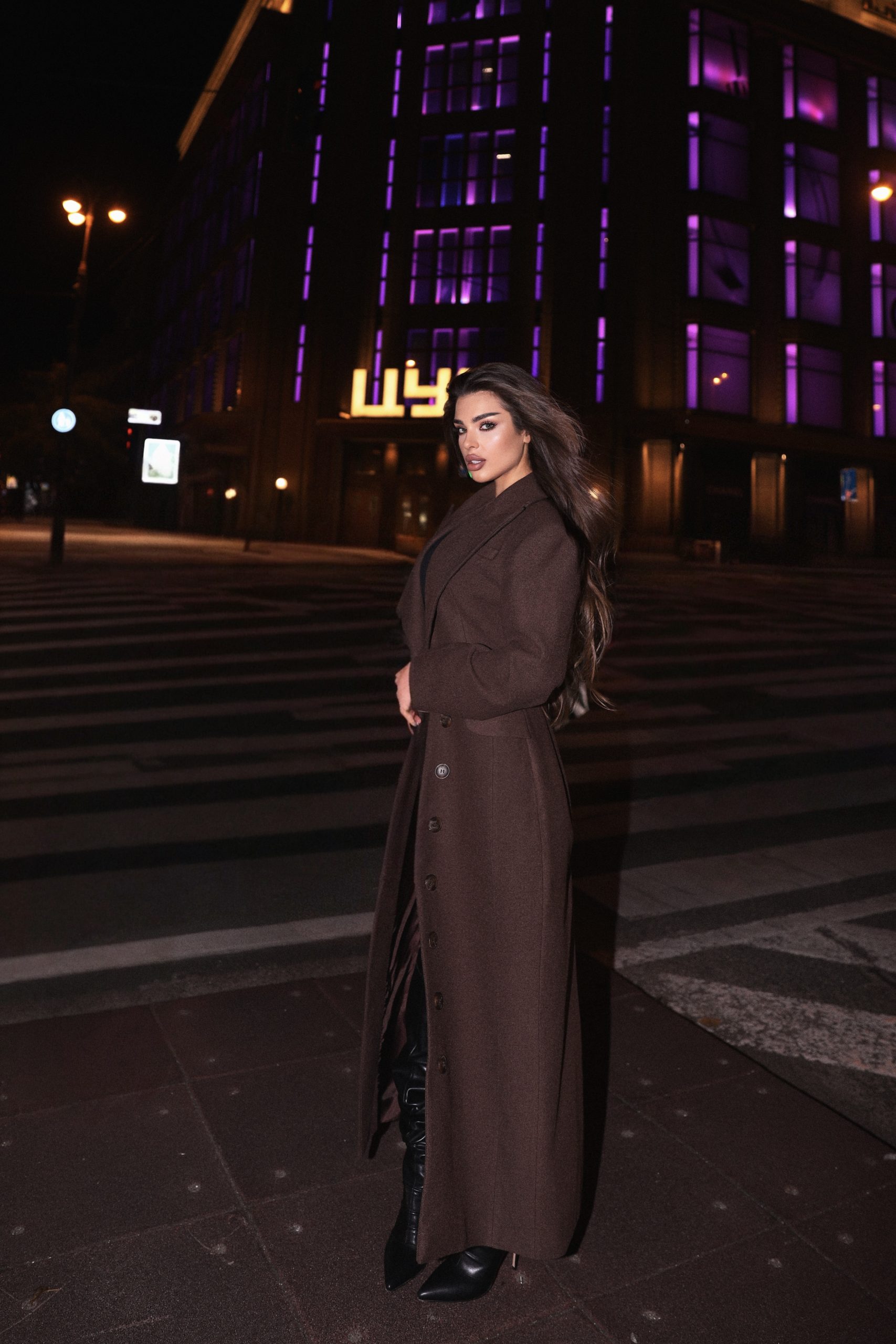 Довге приталене пальто з вовни та кашеміру. Має чітку лінію плечей і структурований силует, що підкреслює фігуру.